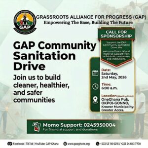 The National Secretariat of the Grassroots Alliance for Progress (GAP) warmly calls on all members across Ghana to lend their full support to the upcoming GAP Community Sanitation Drive.